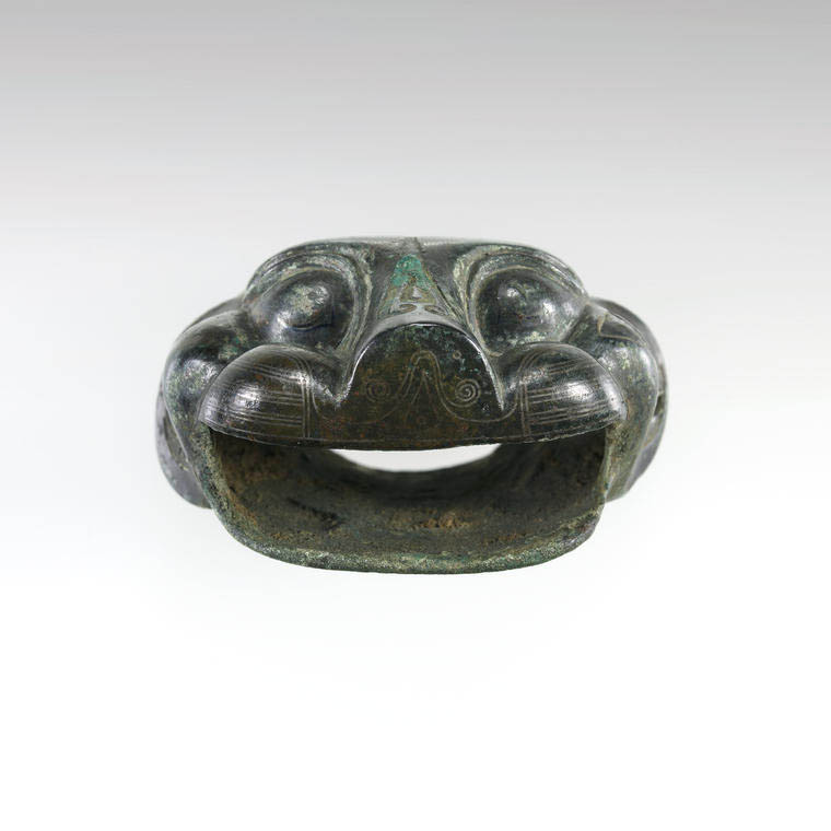 汉代是中国青铜工艺持续发展的时期,错金银作为高级装饰技法,广泛应用于兵器、车马器、礼器等,体现了当时金属工艺的高超水平。动物造型(尤其是狮、虎等猛兽)在汉代装饰中常象征威严与力量,多用于权贵阶层的车马或器物装饰,既具实用装饰作用,也暗含身份等级象征。这件狮头饰件的错金银工艺与生动造型,正是汉代金属工艺与审美取向的体现。