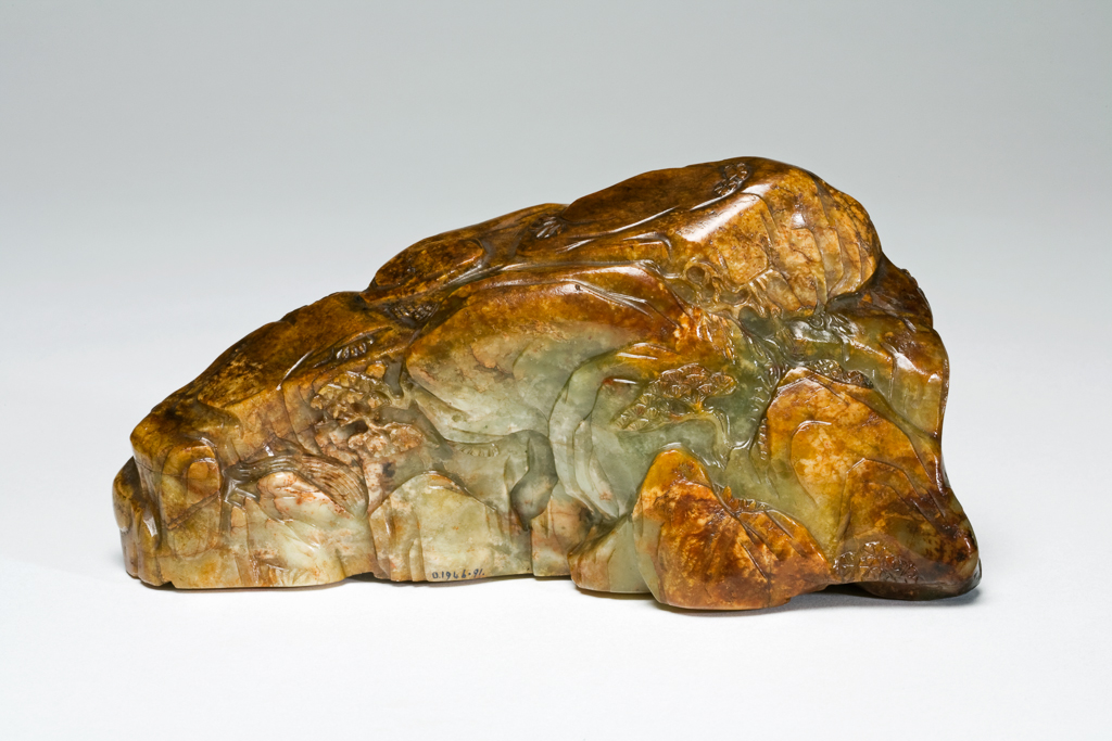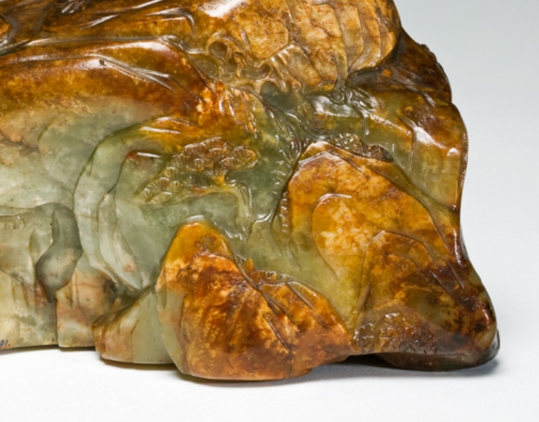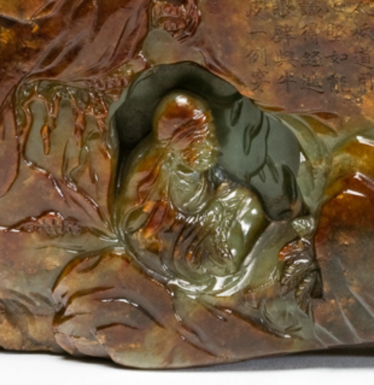 这是一件 18 世纪(1700-1800 年)的软玉摆件,高 7.8 厘米,长 16.8 厘米,为陈设用器。器物采用软玉材质,呈碧绿色,带有大面积褐色区域,利用玉石天然色泽与纹理进行雕刻。主题为 “达摩在险峻山岩间的洞穴中坐禅”:雕刻展现达摩于山中静坐的场景,背景为嶙峋山石,细节生动还原了达摩面壁九年的典故 —— 传说其在少林寺后山五乳峰的洞穴中冥想,神光在洞外守护,洞外岩石上还刻有诗句。此外,这件玉雕的铭文可能源自 18 世纪同一主题的木刻版画。整体工艺精湛,将宗教故事与玉石天然质感结合,兼具艺术观赏性与文化研究价值。