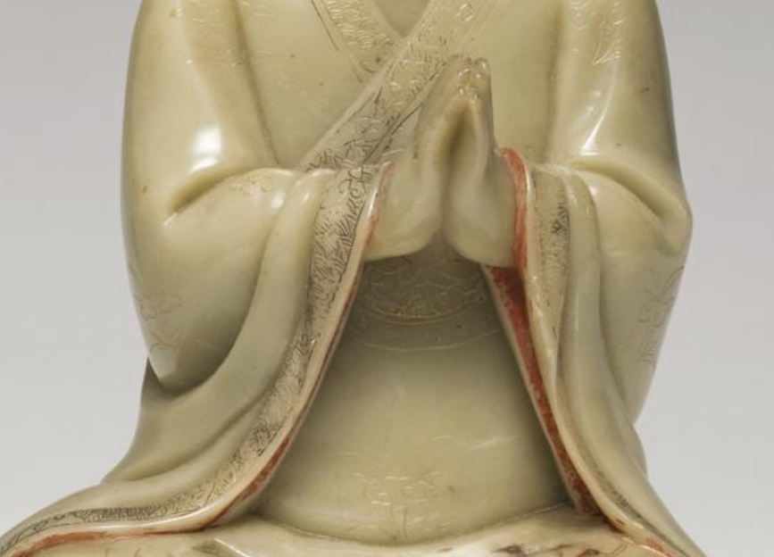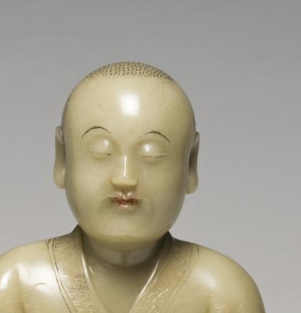 18 世纪正值清代中期,寿山石雕工艺进入繁荣阶段,以其温润的材质和精湛的雕刻技法深受推崇,佛教题材是当时石雕的重要表现内容,体现了宗教文化与民间艺术的融合。罗汉作为佛教中修行得道的代表,其造像常被用于陈设供奉,寄托了人们对修行与觉悟的尊崇。这件罗汉像的闭目合十姿态与缠枝莲纹装饰,既符合佛教造像的传统范式,又反映了清代中期民间石雕对宗教题材的生活化演绎,是研究当时宗教艺术与民间工艺互动的重要实物。