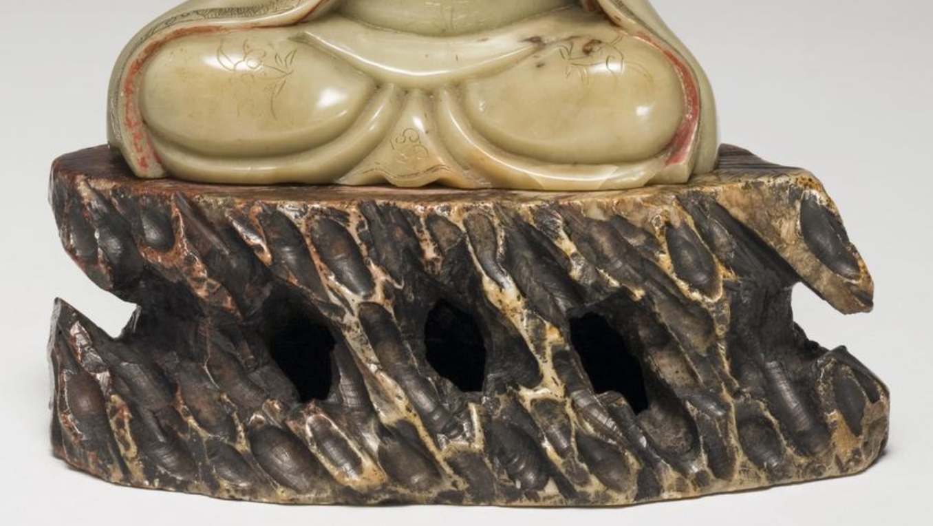 这是一件 18 世纪(1700-1800 年)的寿山石罗汉坐像,连底座高 17.5 厘米,为陈设用佛教造像。器物以寿山石为材质,雕刻内容为一尊闭目静坐的罗汉:罗汉双手合十,呈恭敬姿态,衣袍的领口、袖口及下摆处刻有缠枝莲纹,纹饰以程式化的波浪纹为地,线条细腻规整,既展现了对宗教人物神态的精准刻画,又通过纹饰细节凸显了寿山石雕的工艺水准,兼具宗教象征意义与艺术观赏性。