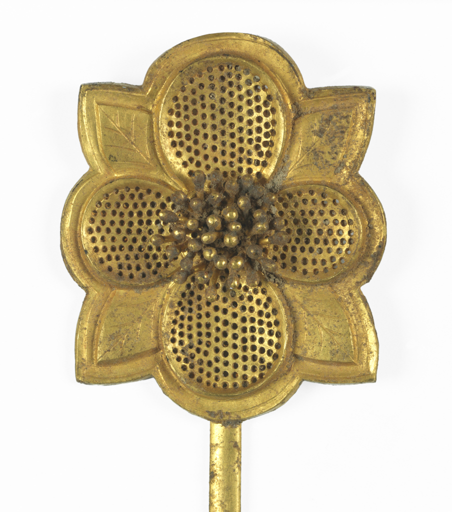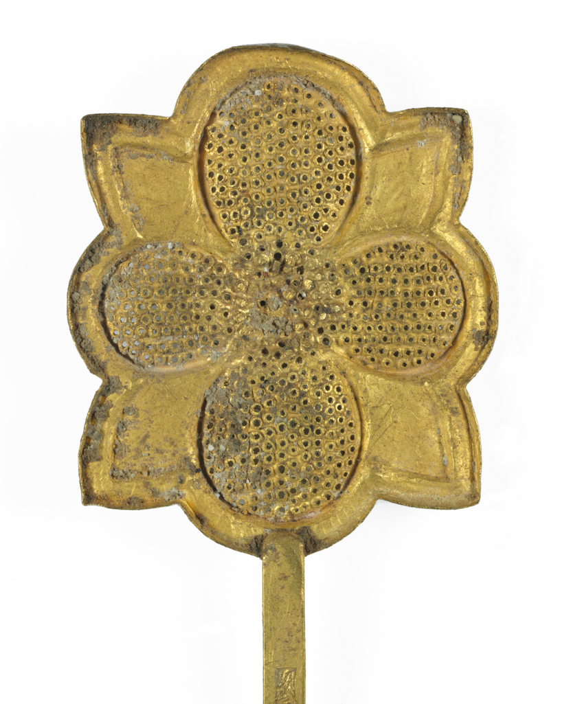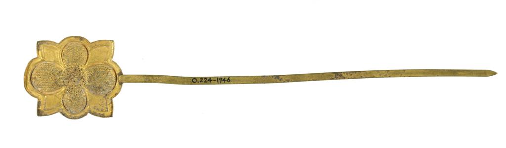 唐至北宋时期是中国金银器发展的繁荣阶段,女性发饰注重造型与工艺的结合,花形题材尤为常见,象征美好与雅致。这一时期的金银器加工技术成熟,镂空、錾刻、焊接等技法广泛应用于发簪等首饰,既体现了当时手工业的精湛水平,也反映了社会对女性装饰的重视。这件金簪的四瓣花造型与叶脉细节,符合唐宋之际发簪 “以花为饰” 的审美取向,是研究该时期女性服饰文化与金银工艺的典型实物。