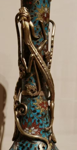 掐丝珐琅(又称“景泰蓝”)虽在元代已传入中国,但真正成熟并形成宫廷风格是在明清时期。明代景泰年间工艺已具规模,而清代在继承明代技术的基础上,进一步改良——从铜胎选材的纯度提升,到釉料配方的精细化(如增加色阶、优化附着性),再到掐丝与烧制流程的标准化,都为这类龙纹瓶的制作奠定了技术基础。