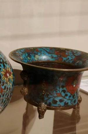 高度,含颈部立体龙纹,整体约 35 - 45 厘米腹部宽度,圆腹直径约 15 - 22 厘米。口径与底径:口径窄,约 5 - 8 厘米。底径因圈足设计,约 8 - 12 厘米。制胎:选铜为胎(清代多用纯铜,质地坚韧易塑形 ),经捶打、裁剪、焊接,制成“细长颈 + 圆腹 + 圈足”造型,打磨光滑做基础。掐丝:取极细扁铜丝,依设计(龙纹、花卉等 )折出轮廓,用“点蓝胶”粘于铜胎,再烧结固定,构建图案骨架。点蓝:将珐琅釉料填入铜丝框,不同颜色分区填色,多次填烧。烧蓝:入窑约 800℃ 高温烧制,让釉料熔融、附着胎体,因釉料膨胀系数与铜胎匹配,需精准控温防开裂。打磨与镀金:烧制后釉面有凹凸,经“粗磨 - 细磨 - 抛光”让表面平整;最后通体鎏金,让铜丝、口沿、龙纹等呈现华丽金色,提升档次与防锈。