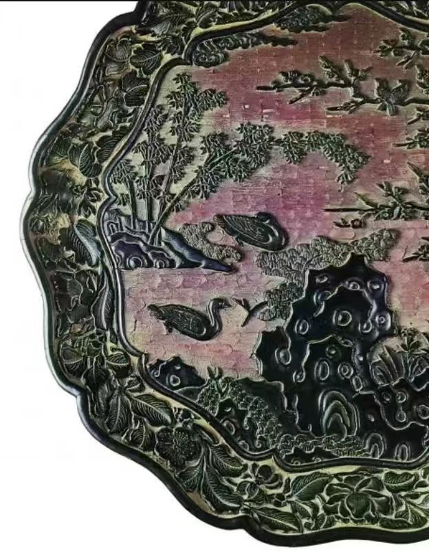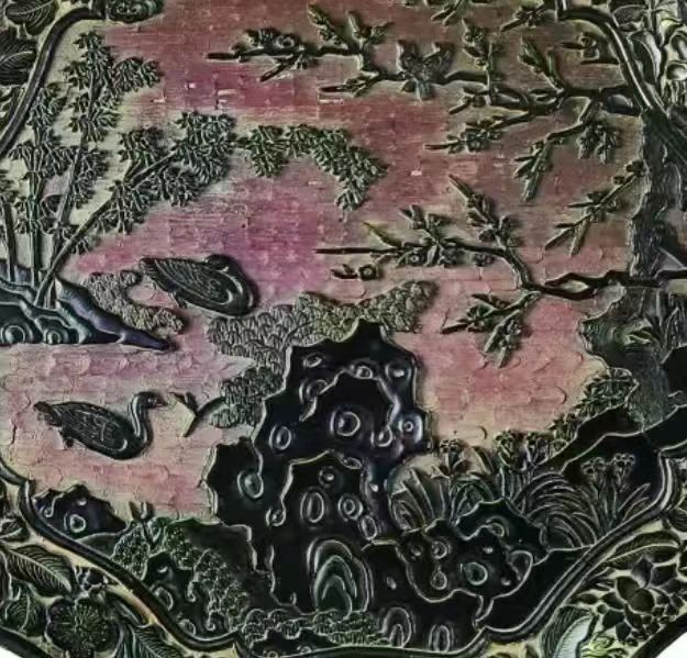 这件漆盘的盘径38.2厘米,色彩上运用了红黑对比的表现手法。其中漆盘盘心的开光内红地,并以剔黑工艺太湖石、树木,以及在湖中悠然自得地游走的两只水禽、树木上闲暇栖息的两只小鸟。而盘口沿周边位置,还雕有盎然怒放的四季花卉。
