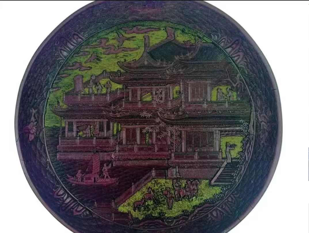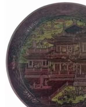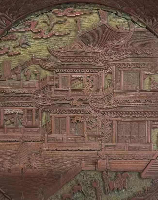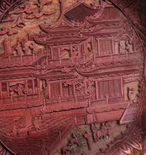 明代滕王阁诗剔彩盘以唐代王勃所作《滕王阁序》蕴含的深厚文化底蕴为依托,凭借精湛的剔彩工艺,将滕王阁建筑风貌与诗文意境生动呈现于盘上。这类剔彩盘多为明代宫廷或富户所拥有的精美工艺品,制作工序繁复,需历经设计、髹漆、雕刻等多道环节。历经岁月流转,一部分留存于国内,被博物馆收藏或为私人藏家所有;另一部分则因中外文化交流、贸易活动,甚至战乱等因素,流散至国外。从漆器工艺发展来看,早期的剔彩工艺在颜色运用和雕刻技法上相对简单。随着明代漆器工艺的不断进步,剔彩盘上的色彩变得更加丰富,漆层的厚度和层次更加考究,雕刻也更加细腻入微,能够生动地表现出滕王阁的建筑细节以及人物、场景等元素。