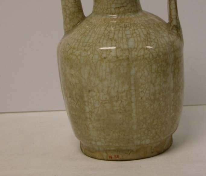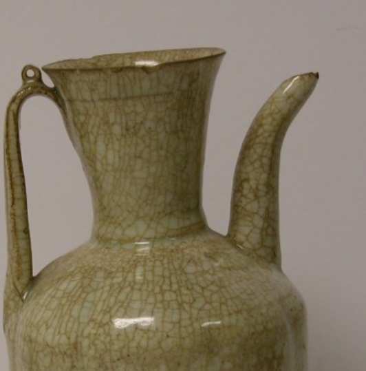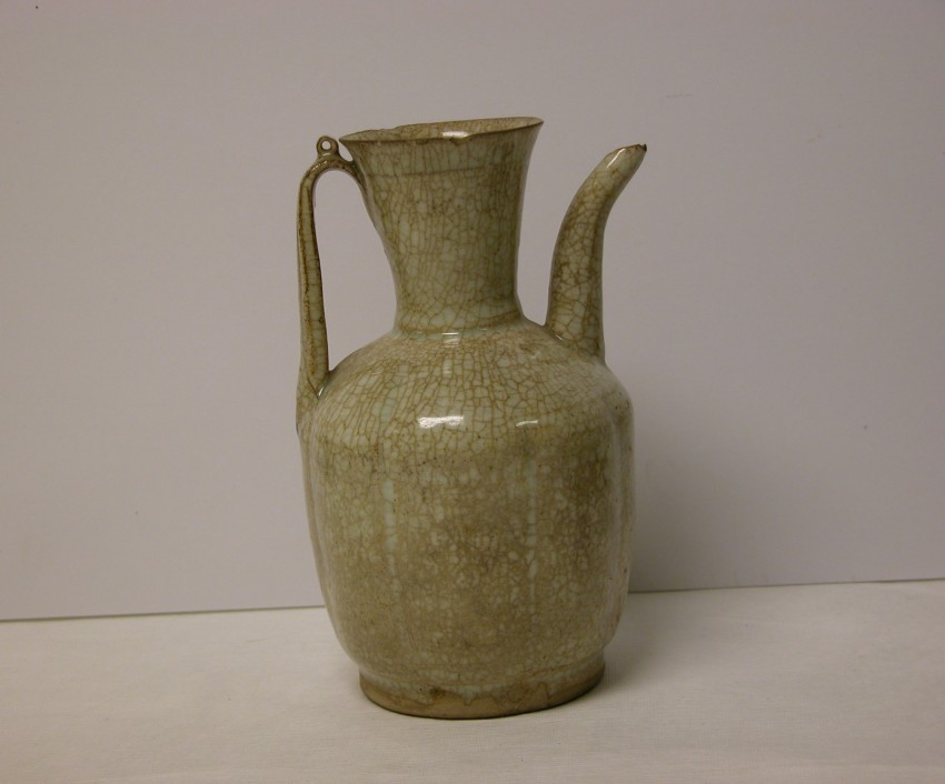 此执壶高18.1 厘米 ,壶身整体造型较为修长。壶口微微外撇,颈部相对较高且略收束。壶腹圆润饱满,外壁施青白釉,釉面有明显的开片纹路,呈现出独特的肌理质感,釉色介于青白色之间,泛着淡雅的光泽。壶流细长弯曲,与壶身衔接自然流畅;壶柄造型简洁,方便握持,且在壶柄顶端有一个小环装饰 。底部为圈足,圈足处能看到胎体的部分颜色,呈现出浅灰色调 。