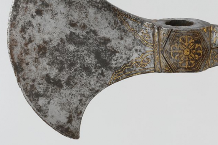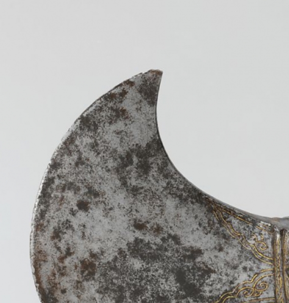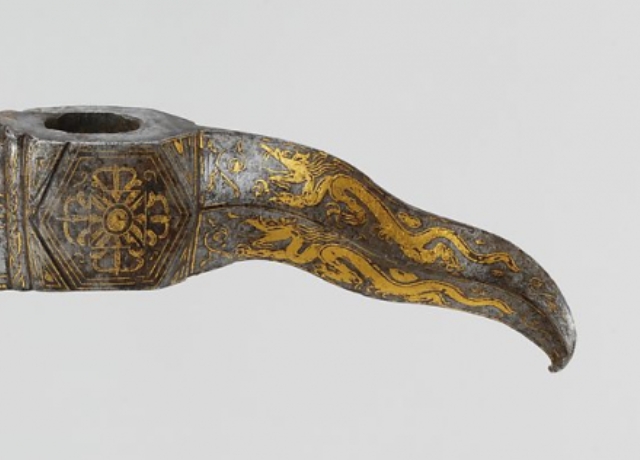 明清时期,冷兵器在军事与仪仗中仍占据重要地位,同时金属装饰工艺高度发达,鋄金等技法常用于提升器物的华贵度与象征意义。龙纹在这一时期被严格限定为皇家专用,此斧头装饰龙纹,推测可能与皇室仪仗或高级将领相关,用于彰显身份与权威。其工艺与纹饰反映了明清时期的等级制度、手工业水平及审美取向,是研究该时期兵器文化与金属工艺的实物资料。