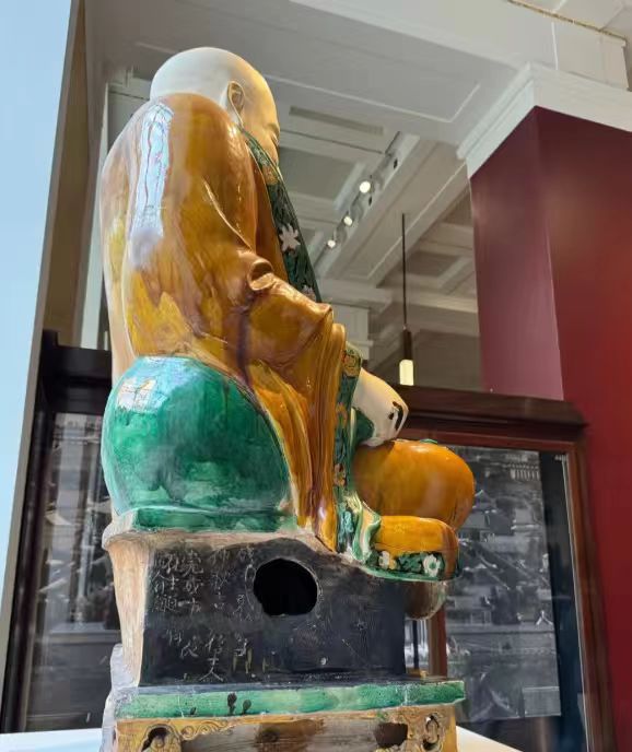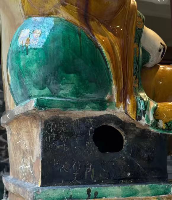 作为明代典型的三彩釉陶造像,其釉色以黄、绿、白为主,色彩温润柔和,展现出明代琉璃工艺的精湛技艺。