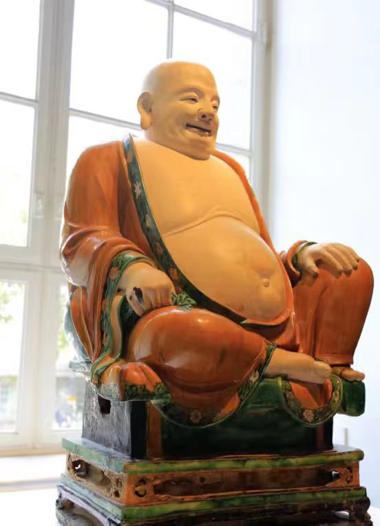 布袋和尚穿着松垮的黄色僧袍,右手提绿色布袋似乞丐模样。布袋和尚世传为弥勒菩萨或弥勒佛之应化身。座上有铭文:"成化二十年(1484年)仲秋吉日造信士人黨成惠氏化主道濟匠人劉鎮"