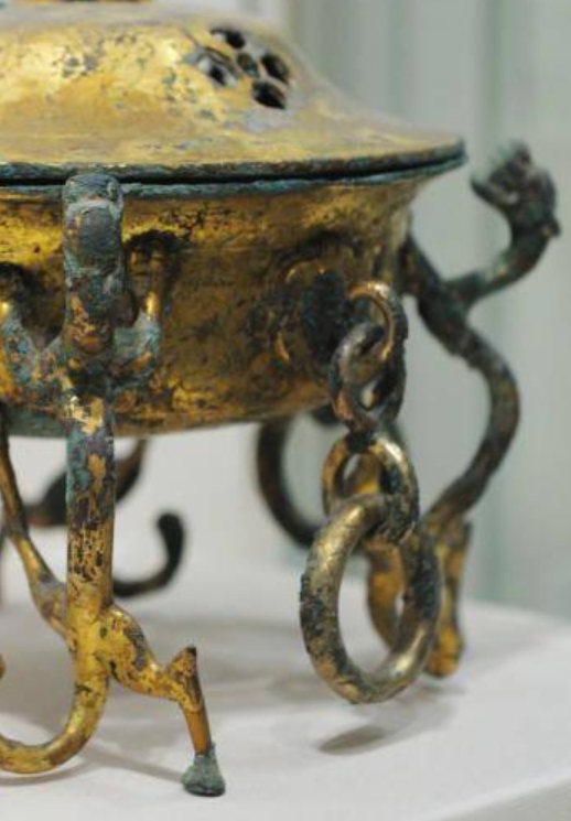 该鎏金香炉以青铜等金属为材质,整体造型较为精巧。炉盖为穹顶形,顶端有球形钮,炉盖上分布着多个镂空孔洞,便于香气散发。炉身表面大部分区域施有鎏金工艺,虽历经岁月,部分鎏金层有所磨损,露出青铜底色,但仍能看出曾经的华美。炉身四周有造型独特的附属构件,似龙形或其他神兽造型,与炉身以链条相连,链条弯曲灵动,增添了器物的灵动感 。底部有多个弯曲的支撑足,使香炉稳固放置。