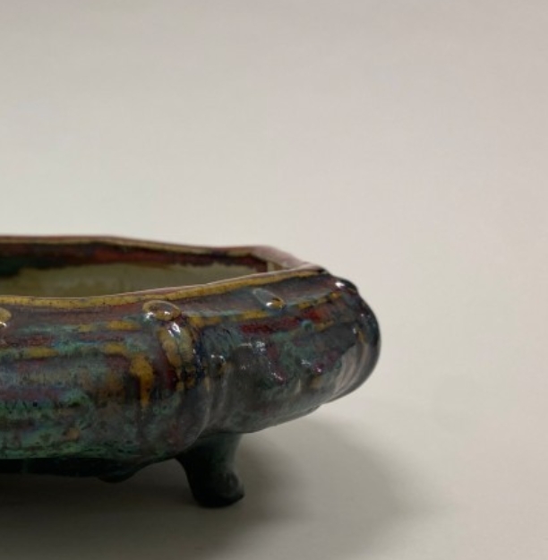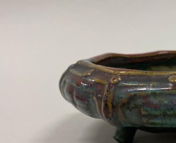 此炉以火烧釉陶器为材质,高 6 厘米,直径19.1 厘米。器物为三足造型,结合 “八卦” 元素推测,炉身可能装饰有八卦纹饰,体现道教文化元素。施钧釉,釉色可能呈现出窑变效果,色彩丰富且富有层次感,展现出石湾窑仿钧釉的工艺特色。作为香炉,兼具实用与陈设功能,造型古朴庄重,釉色与纹饰的搭配彰显出清代石湾窑陶瓷的独特风格。