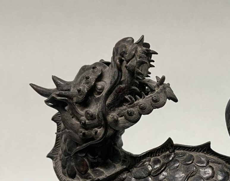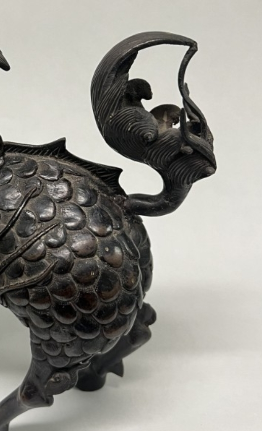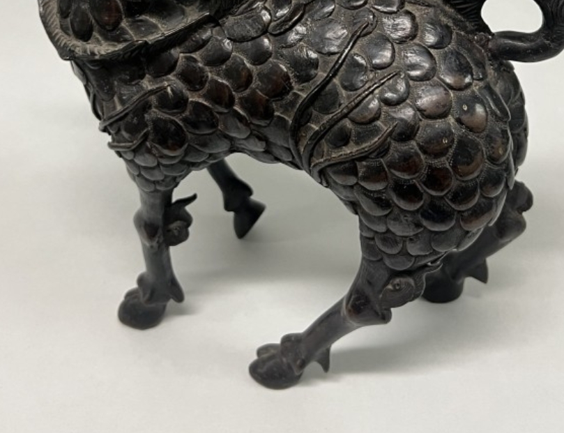 此香薰炉以青铜为材质,高 29.2 厘米,宽 25.4 厘米。整体造型为麒麟形态,将香薰炉与麒麟造型相融合,推测麒麟的头部、身躯、四肢等细节刻画生动,既具备香薰炉焚香散气的实用功能,又通过祥瑞的麒麟造型增添了装饰性与象征意义,展现出明末清初铜器制作在造型设计上的匠心与工艺水准。