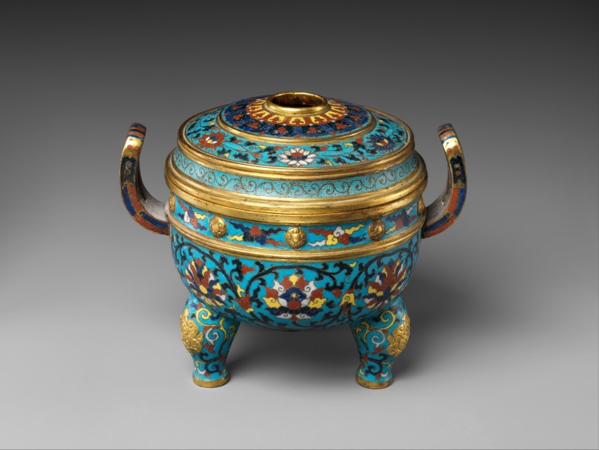 此炉以铜为胎,采用景泰蓝(掐丝珐琅)和内填珐琅两种工艺制成,高 14.7 厘米,直径 13.4 厘米。炉身饰有缠枝莲纹,炉身采用掐丝珐琅工艺,把手采用内填珐琅工艺 —— 内填珐琅需在金属炉身雕刻出纹路以填入珐琅彩泥,不同于掐丝珐琅用铜丝分隔珐琅。珐琅色彩鲜艳,视觉效果出众,整体兼具实用与装饰功能,体现了明早期珐琅工艺的精湛水准与创新特点。