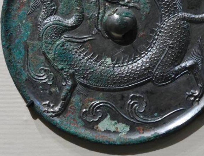 此铜镜以青铜为材质,整体呈圆形。镜面中心有一圆形镜钮,方便手持或悬挂。镜背主体纹饰为一条龙,龙身蜿蜒矫健,鳞片刻画细致,展现出灵动的姿态 ,四周还装饰有一些云纹或波浪纹等辅助纹饰,与龙纹相呼应,丰富了画面的层次感。铜镜表面有斑驳的铜锈,呈现出古朴的色泽,见证了岁月的侵蚀。