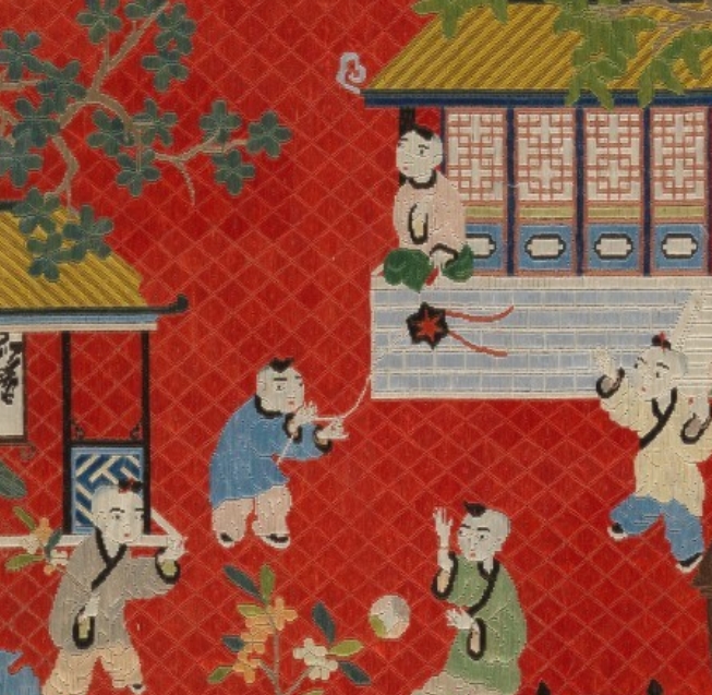 清代刺绣工艺高度发达,广泛应用于各类生活用品,纹饰题材丰富,婴戏图作为传统吉祥纹饰,象征多子多福、生活喜乐,反映了当时社会对美好生活的向往与民俗文化内涵。此镜囊的刺绣工艺与纹饰选择,展现了清代手工业者对生活场景的艺术化表达,为研究清代刺绣技术、民间审美及社会生活观念提供了实物依据。