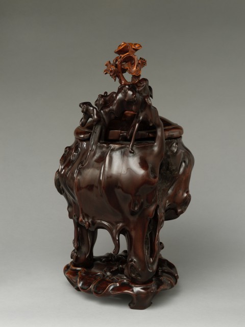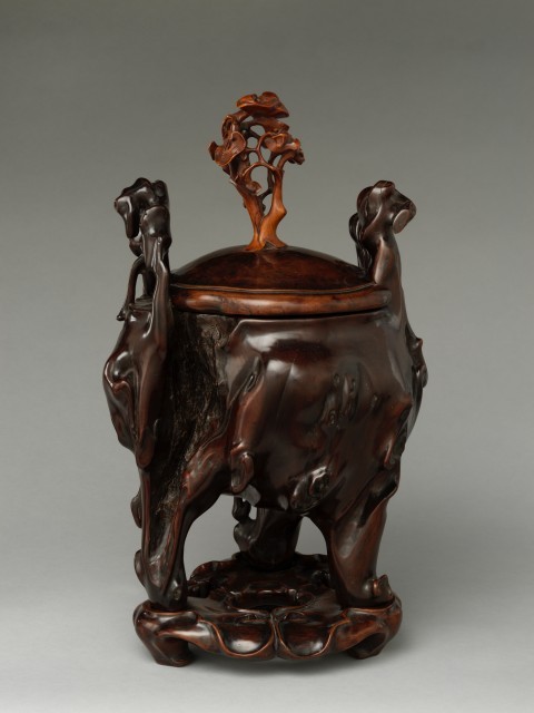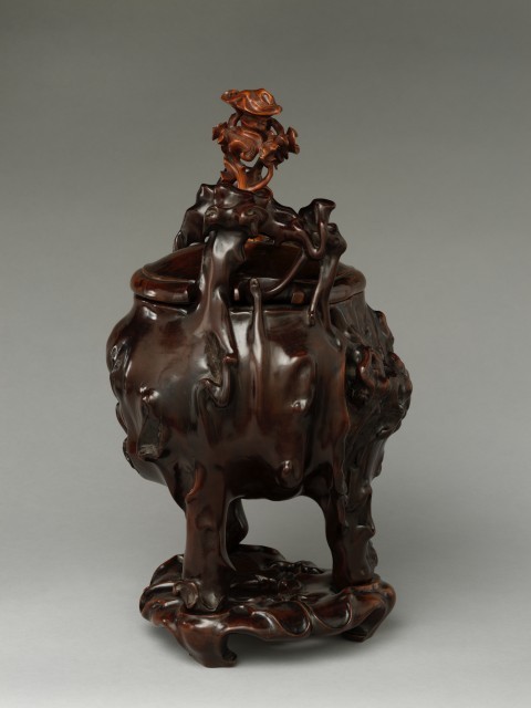 此香炉以根木、黄杨木和玫瑰木为材质,高 56 厘米,直径 33 厘米,重量 8.2 千克。作为三足香炉,它是中国根木雕刻的罕见典范,采用 “天然木” 工艺,通过突出根木固有的不规则性来营造质朴风格,同时复制青铜三足的形状,既具备焚香功能,又融入文人推崇的古朴品味,体现了清代木雕工艺对自然与古物双重内涵的融合。
