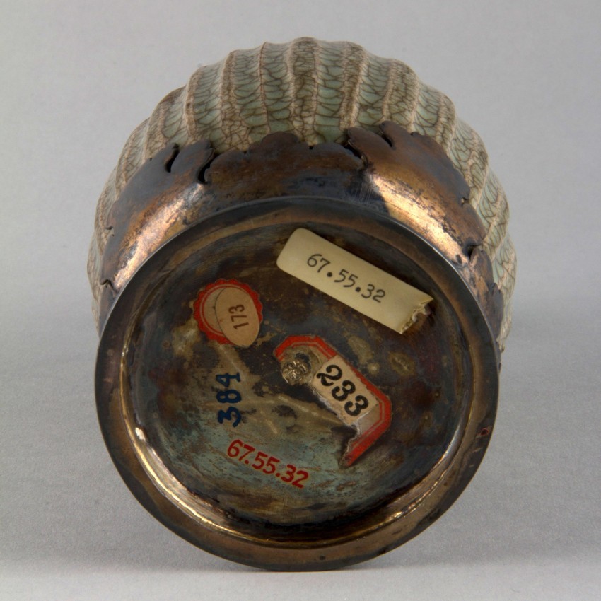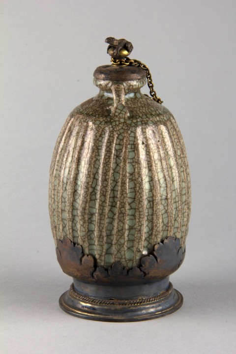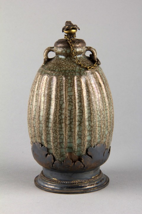 此罐以裂纹釉陶器为材质(属漳州窑制品),配有金属底座,高 16.8 厘米,底座直径 7.9 厘米。器型为瓜楞双系罐,“瓜楞” 指器身呈多棱瓜形,“双系” 即两侧有供穿绳或手提的耳状装饰,哥釉的裂纹效果自然古朴,既具备储物的实用功能,又展现出明代漳州窑在釉色与造型设计上的特色,体现了当时陶瓷工艺的水准。