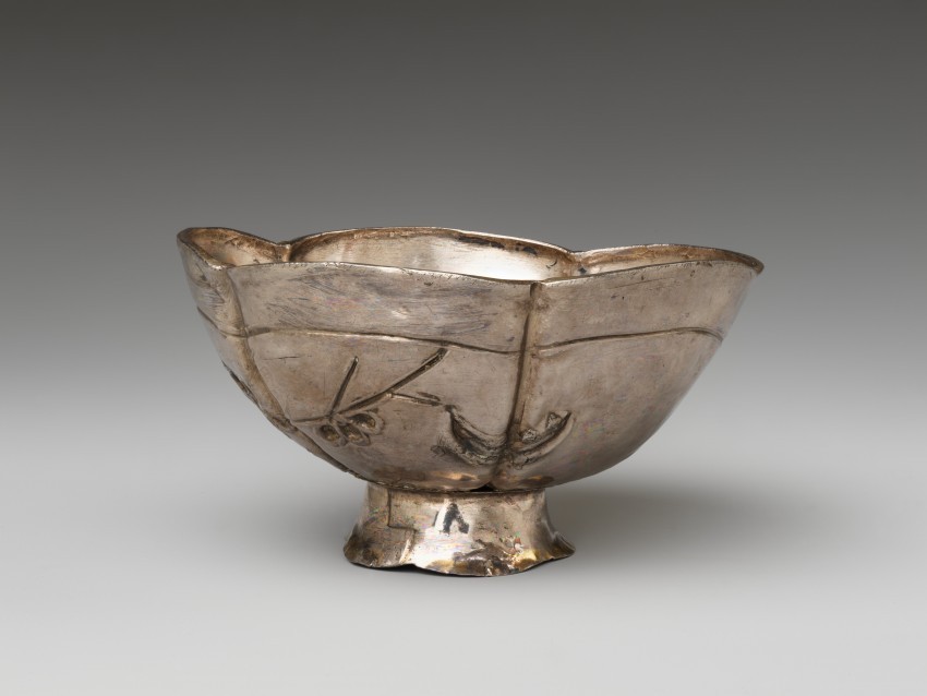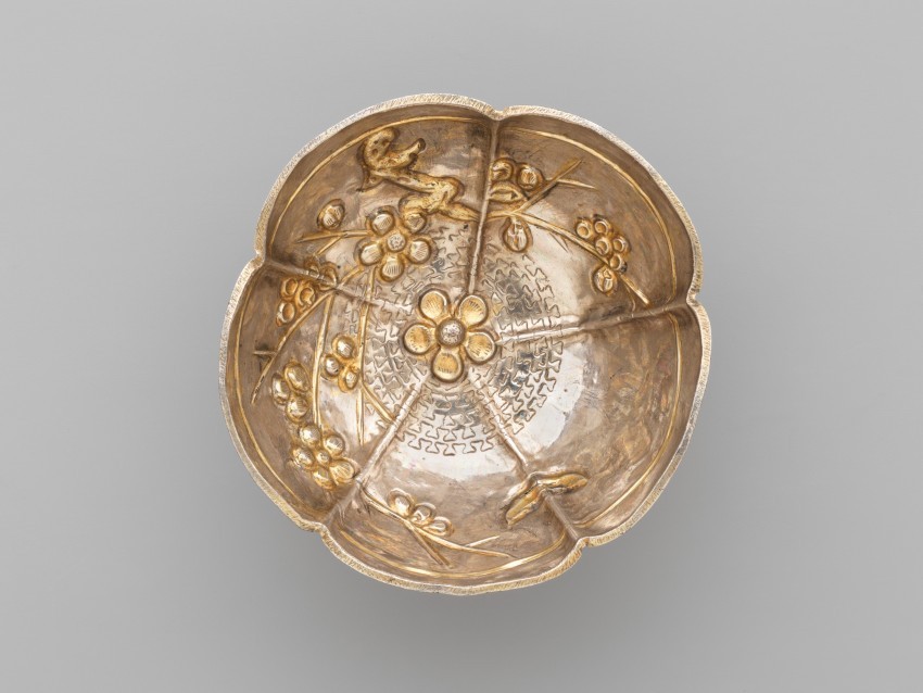 此杯盏以银为材质,带有浮雕装饰和镀金工艺,高 5.1 厘米,直径 9.5 厘米,脚直径 4.1 厘米。纹饰主题为月影梅纹,描绘月光下的梅花图案,灵感源自 13 至 14 世纪诗歌中的类似意象,既具备饮酒的实用功能,又通过雅致的纹饰与金属工艺的结合展现出文化内涵与装饰性,体现了元代银器制作的精湛水准。