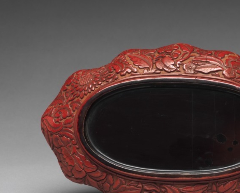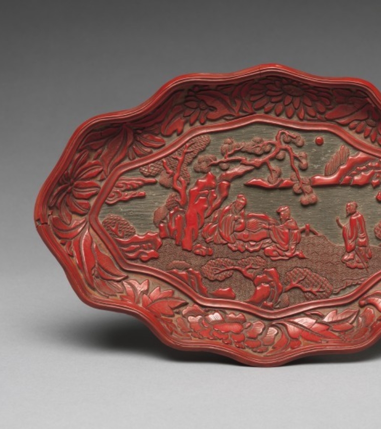 宣德年间是明代漆器工艺的鼎盛时期,剔彩工艺以红绿等色漆分层髹涂后雕刻成型,技法成熟且富有表现力。道教文化与文人隐逸思想在当时影响深远,“仙人对弈” 作为传统题材,常出现在工艺美术中,反映了当时社会对超脱尘世的精神追求。此漆盘的题材选择与工艺特征,为研究明代宣德时期漆器技术、宗教文化与艺术题材的融合提供了实物依据。