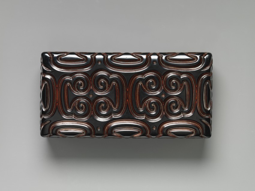 此漆盒以黑红雕漆为材质,采用剔犀工艺制成,高 6.9 厘米,宽 11.7 厘米,长 23.2 厘米,呈长方形。黑色主体上有三层红漆,黄色底色增添了额外色彩,纹饰为剑环纹,既具备盛放文件的实用功能,又通过色漆的层次与雕刻的纹饰展现出独特的美学风格,体现了晚明时期对鲜明美学组合的品味及剔犀工艺的精湛水准。