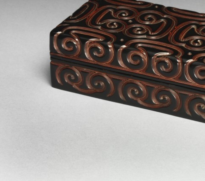 明代是雕漆工艺的鼎盛时期,剔犀作为雕漆的重要门类,以黑红等色漆分层髹涂后雕刻花纹为特点,16 世纪的明代在技法上已相当成熟。此漆盒用于盛放文件,与文人的日常文化生活相关,其色彩搭配与纹饰设计反映了当时社会对古朴雅致风格的追求,为研究明代雕漆工艺的技术特征、器物功能与审美取向提供了实物依据。