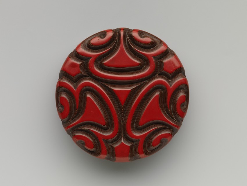 此盒以雕彩漆器为材质,采用剔犀工艺制成,高 3.6 厘米,直径 10 厘米。纹饰为剑环纹(又称 “剑柄卷轴” 图案,因括号状卷轴类似中国剑的剑柄得名),既具备盛放物品(如带鞍头卷轴)的实用功能,又通过雕刻的独特纹饰展现出历史传承的审美意趣,体现了明代雕漆工艺在纹饰设计与制作技法上的水准。