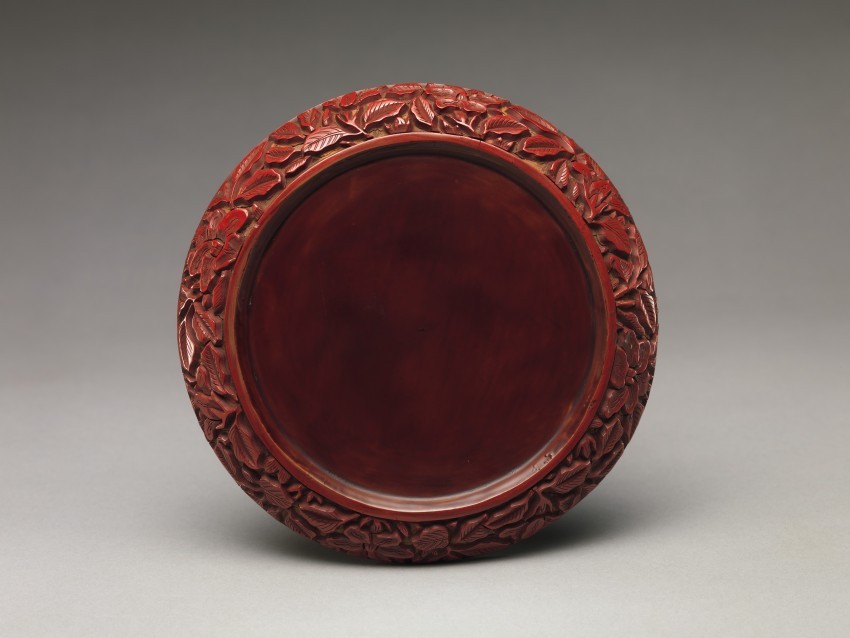 此对雕漆盘以雕红漆为材质,采用剔红工艺制成,每个直径 15.2 厘米。盘上雕刻深而密的纹饰,分别展现牡丹和莲花的艺术组合,工艺费时费力且成本高昂,推测并非用于日常用餐,而是作为摆设或招待客人时盛放糖果等物品,兼具装饰与实用功能,体现了明代早期剔红工艺在纹饰刻画与制作技法上的精湛水准。