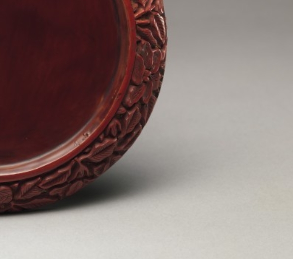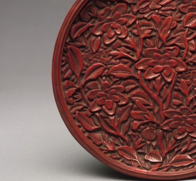 14 世纪末至 15 世纪的明早期,雕漆剔红工艺处于发展高峰,花卉纹(如牡丹、莲花)因象征富贵、高洁等吉祥寓意,成为漆器装饰的重要题材。此对漆盘的纹饰选择与工艺特征,反映了当时社会对精美工艺品的追求及花卉纹饰在工艺美术中的流行,为研究明代早期剔红技术、装饰题材与器物功能的关联提供了实物依据。