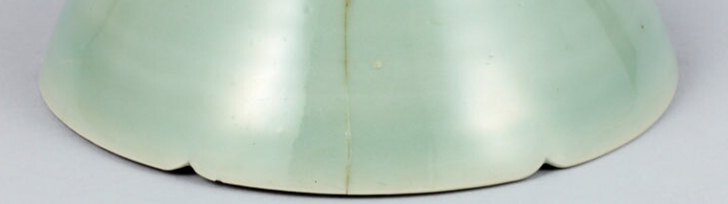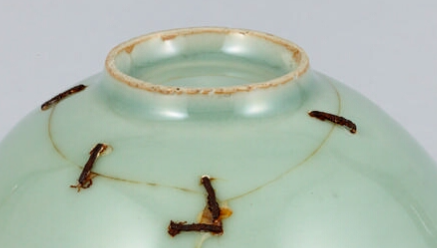 该青瓷茶碗高9.6,口径15.4,高台直径4.5。此作品不仅身姿、釉色美丽,整体造型为六瓣花形茶碗,葵口设计,口沿呈六出花状,线条流畅自然,宛如盛开的花朵。弧腹,腹部线条圆润饱满,从口沿到底部逐渐收敛,给人一种优雅的曲线美。圈足规整,底部平整,与碗身比例协调,使得茶碗放置稳固。通身施青釉,釉色为粉青或梅子青,色调纯净,柔和淡雅,如冰似玉,晶莹剔透,仿佛蕴含着无尽的温润与光泽,将龙泉窑青瓷 “类冰似玉” 的特点展现得淋漓尽致。口沿的釉由于向下流淌,较薄,呈现出一种淡淡的透明感,而碗身下半部釉则较厚,釉质肥厚,更显质感厚重。的底部和器壁布有内外穿透的裂痕,这些裂痕是在流传过程中自然形成的。外壁嵌入六枚锔钉,未穿透器壁,锔钉为铁质,形状为匀称的平锔钉,规整小巧,分布错落有序,因锔钉形状像大蚂蝗,故得名 “蚂蝗绊”。历经数百年,铁锔钉已经生锈,呈现出一种古朴的铁锈色,与青釉的翠绿色相互映衬,更增添了几分历史的沧桑感和独特的残缺之美。
