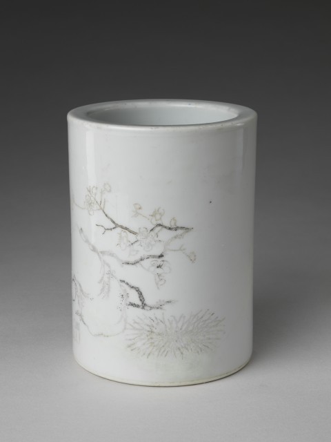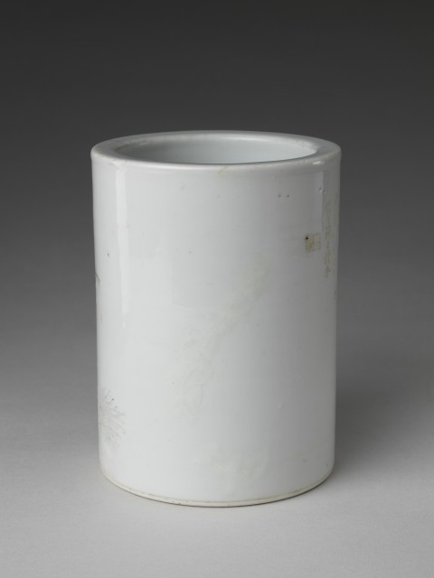 此笔筒以白釉墨彩瓷器为材质(属德化瓷),高 14.9 厘米,直径 11.1 厘米。器身以墨彩绘制扭曲的梅枝生长于崎岖岩石间的景致,剩余空间题有一首诗(推测为作画艺术家所写),底部刻有六字款及题识:“金吉金写菖蒲,拳石曰石为嫁蒲。余谓既嫁蒲家郎,非梅不得也。余亦写菖蒲拳石,表缀梅华一枝。戊午胡公寿记于海上精舍。[印]:公寿金吉”。既具备放置毛笔的实用功能,又通过诗画结合的形式展现出文人审美与文化内涵,体现了清代晚期德化窑在白釉墨彩工艺与文人题材融合上的特色。