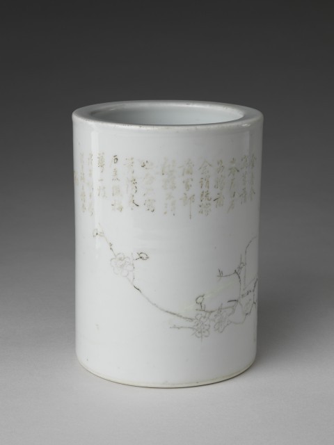 清代光绪年间,德化窑瓷器在传统白瓷基础上继续发展,墨彩装饰因便于表现文人书画意趣而受到青睐。梅枝、岩石等自然意象与诗文题咏的结合,是文人文化影响工艺美术的典型体现,反映了当时社会对雅致生活的追求。此笔筒的工艺与纹饰,为研究清代晚期德化窑的制瓷技术、文人参与器物装饰的方式提供了实物依据。