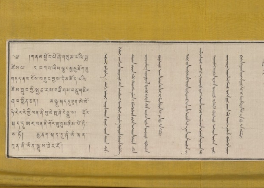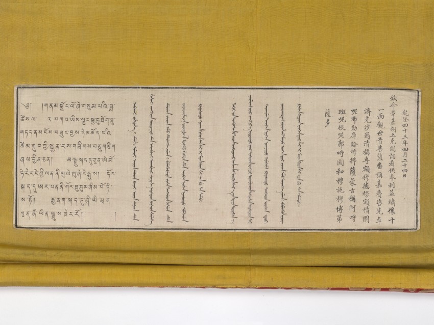 18 世纪的乾隆时期,清朝宫廷刺绣工艺达到鼎盛,常融合宗教题材展现皇家艺术水准。藏传佛教在清廷影响深远,章嘉呼图克图三世作为蒙古藏传佛教代表,曾参与宫廷宗教艺术品的创作指导。此唐卡作为 1778 年在其指导下完成的作品,体现了宫廷对藏传佛教的尊崇,以及刺绣工艺在宗教艺术表达中的精湛应用,为研究清代宫廷刺绣技术、藏传佛教文化与多民族文字融合提供了实物依据。