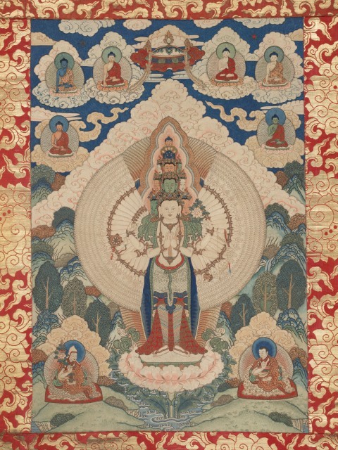 此唐卡以丝绸和金属线为刺绣材质,整体尺寸为 142.2×85.1 厘米。作品中心是十一面观音(慈悲菩萨的化身之一),其十一个头象征通往开悟之路的步伐,周围环绕一千只手臂,每只手掌中央各有一只眼睛,刺绣细节极为精致。背面有中文、满文、藏文和蒙古文题词,记录了创作背景,兼具宗教供奉功能与极高的艺术价值,代表了 18 世纪清朝宫廷刺绣的最高成就。