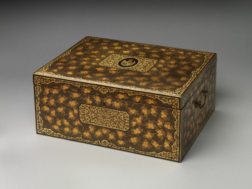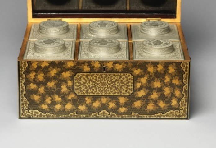 此盒以黑漆金彩为材质,高 20.6 厘米,宽 30.5 厘米,长 46.7 厘米。盒身带有亚历山大・汉密尔顿徽章纹饰,采用描金彩绘工艺装饰,推测原功能可能为茶箱(用于存放茶叶相关物品),兼具储物实用功能与精致的装饰性,体现了 18 世纪末中国漆器在工艺技法与定制设计上的特色。