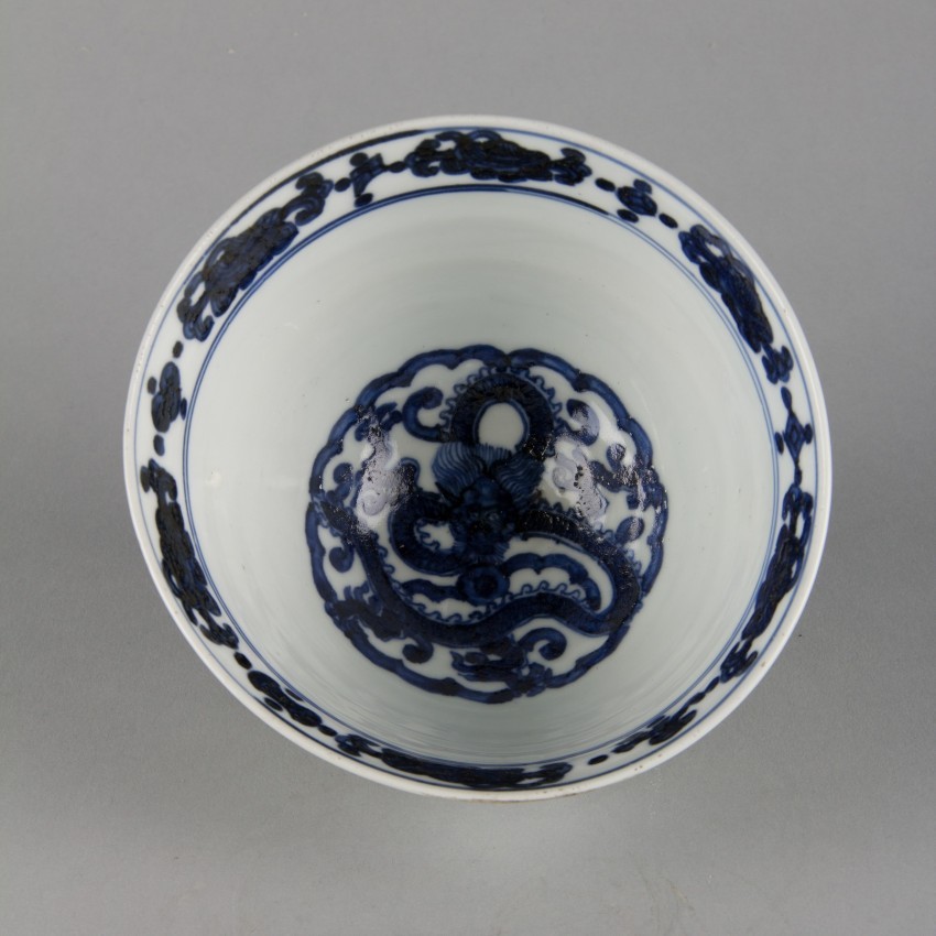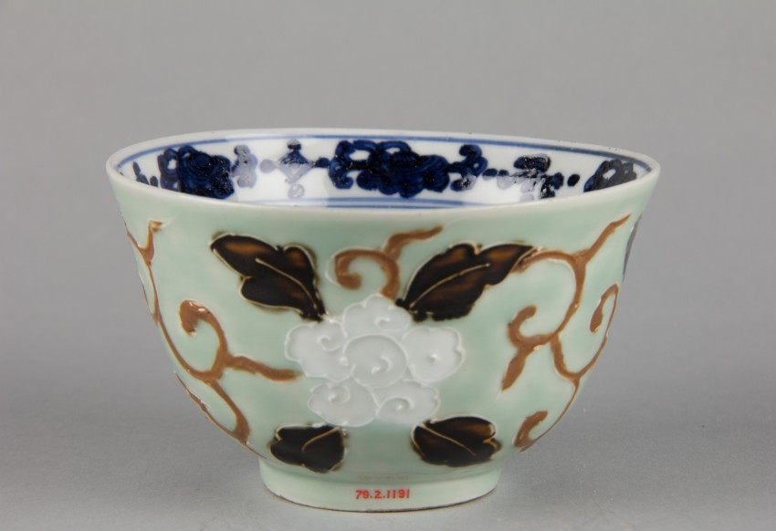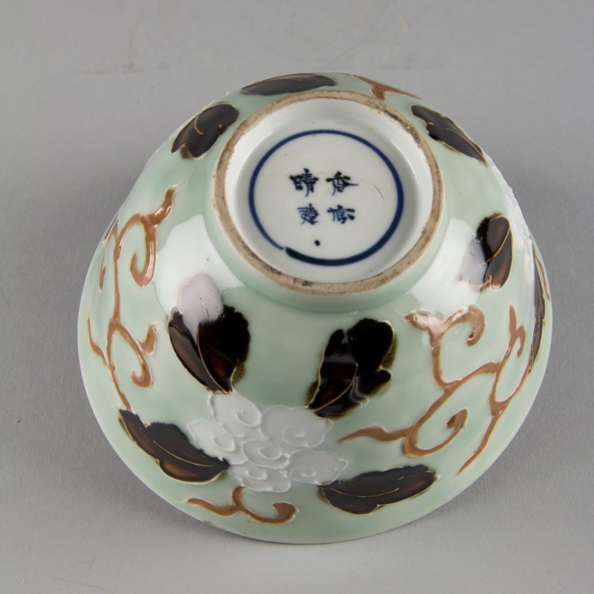 此碗以釉下钴蓝色瓷器为基础材质,结合浮雕装饰及青瓷(豆青釉)、深棕色釉料制成,高 8.3 厘米,口沿直径 14 厘米,足部直径 6 厘米。碗外施豆青釉并采用堆塑粉彩工艺装饰花卉纹,内壁则以青花绘制龙纹,兼具盛放食物的实用功能与多层工艺结合的装饰性,体现了 19 世纪清代瓷器在釉色搭配、纹饰布局与工艺融合上的特色。