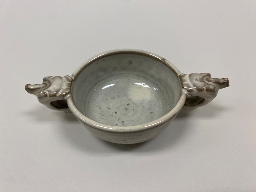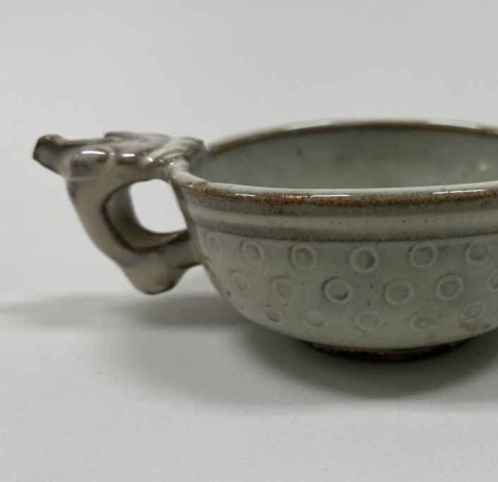 此杯以钧瓷为材质(属宜兴窑产品),高 4.1 厘米,宽 14.6 厘米,直径 7.6 厘米。杯身施宜钧釉,釉色温润雅致,设有双兽耳(又称 “双兽头柄”),兽首造型生动,线条流畅,兼具实用(饮酒或陈设)与装饰功能,充分体现了 19 世纪宜兴窑在仿钧釉工艺及动物造型装饰上的鲜明特色与精湛水准。