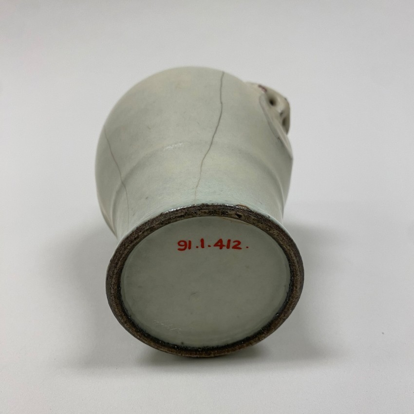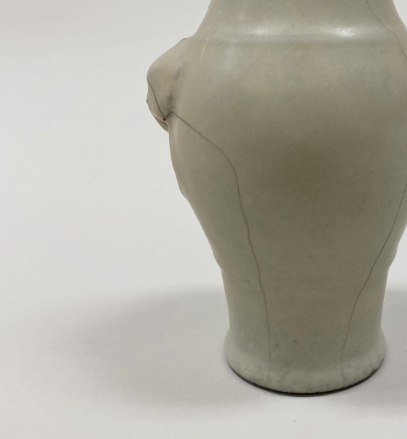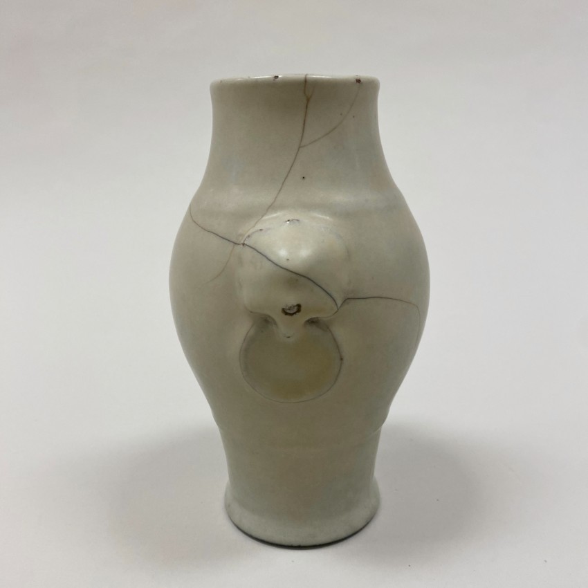 此瓶以裂纹釉瓷器为材质(属景德镇瓷器),高 15.6 厘米,直径 5.4 厘米。瓶身施哥釉(裂纹釉),釉面布满自然开片,形成独特的纹理美感,肩部设有兽耳(又称 “动物面具”)装饰,造型古朴雅致,兼具陈设装饰功能与仿古韵味,体现了 18 世纪景德镇窑在哥釉工艺及传统兽耳造型运用上的精湛水准。