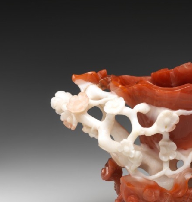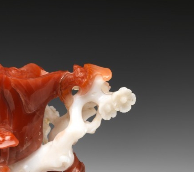 此花插以红玉髓(南红玛瑙)和白玛瑙为材质,高 12.7 厘米,宽 19.7 厘米,深 10.2 厘米。采用俏色巧雕工艺,依玛瑙天然色泽差异雕琢花卉图案,将红色与白色部分巧妙结合,既具备插花的实用功能,又通过自然色彩与雕刻纹饰展现出独特的艺术美感,体现了 18 世纪中国玛瑙雕刻在俏色运用与花卉题材表现上的精湛水准。