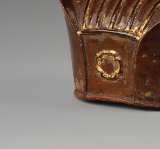 此发冠以漆器和镀金木材为材质,高 5.4 厘米,宽 5.7 厘米,作为古代发饰使用,将漆器的温润质感与镀金木材的华贵光泽相结合,兼具束发的实用功能与头部装饰的美观性,体现了宋代在日用漆器与服饰配饰制作上的工艺特色。