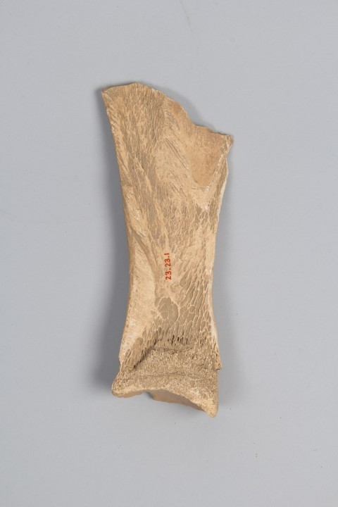 此甲骨碎片以刻骨为材质,尺寸为 8.9×20.3 厘米,属于甲骨文残片,是商代用于占卜或记录占卜内容的载体,其甲骨质地与上面的刻字(作为中国最早成熟文字系统的遗存),既承载着商代的占卜信息,又具有早期文字载体的珍贵历史价值,体现了商代甲骨文化在记录与信仰方面的物质特征。