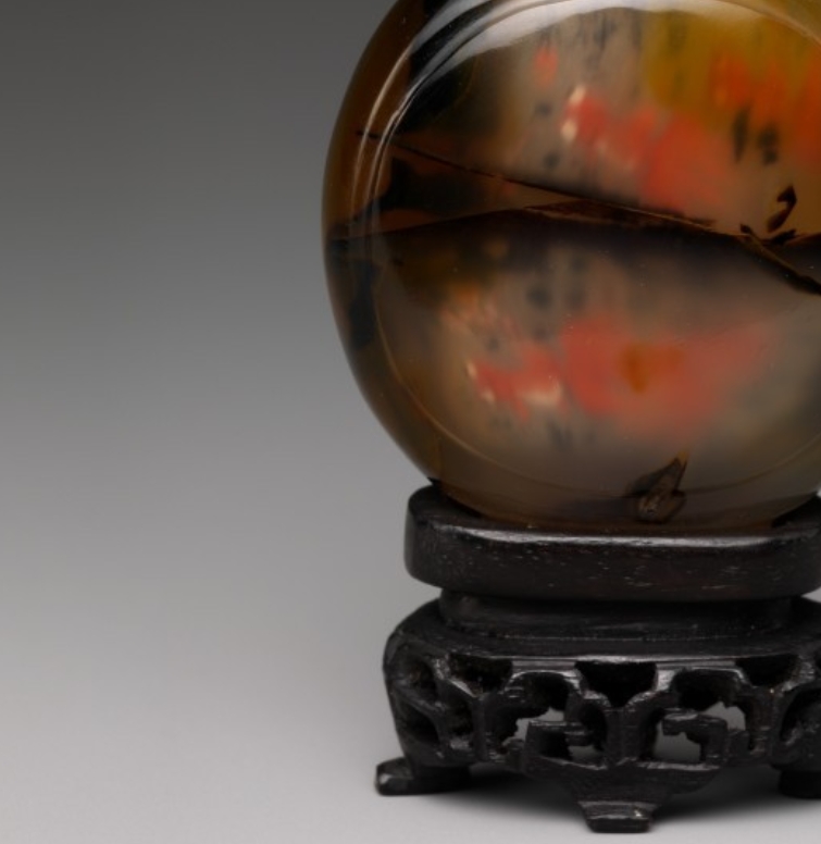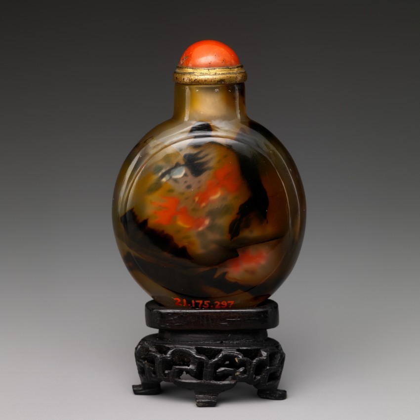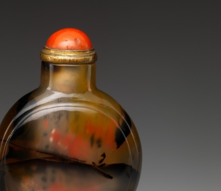 此鼻烟壶以海蛇玛瑙为主要材质,搭配珊瑚塞,高 5.4 厘米。采用内画工艺,通过狭窄瓶口用带角度的竹笔在壶内壁绘制金鱼纹,兼具盛放鼻烟的实用功能与内画艺术的装饰性,体现了乾隆时期鼻烟壶在材质选择与内画工艺结合上的特色。