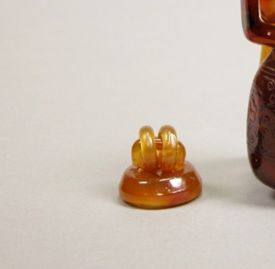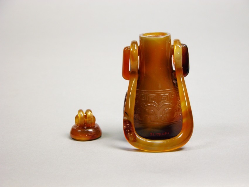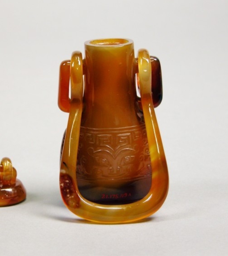 19 世纪的清代,硬石雕刻工艺持续发展,玛瑙因其温润的质地和丰富的色泽成为重要的雕刻材料。挂瓶作为一种兼具实用性与装饰性的陈设器物,常用于室内悬挂点缀,反映了当时社会对雅致生活环境的追求。此玛瑙挂瓶的材质与造型,为研究清代玛瑙雕刻技术的应用及陈设器物的发展提供了实物依据。