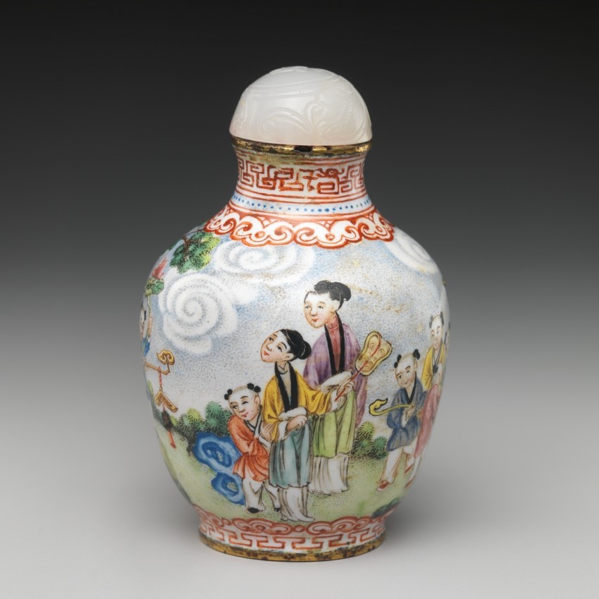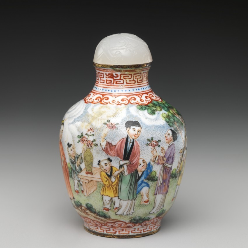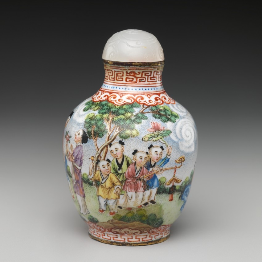 19 世纪的清代,铜胎画珐琅工艺在继承前代基础上持续发展,广泛应用于各类器物装饰。“四妃十六子” 题材蕴含多子多福的吉祥寓意,是传统装饰中的经典纹样,反映了当时社会的伦理观念与审美取向。此鼻烟壶将实用功能与吉祥纹饰、精湛工艺相结合,为研究清代珐琅工艺的世俗化应用及鼻烟壶的文化象征意义提供了实物依据。