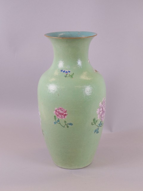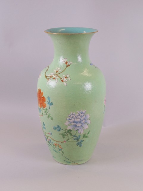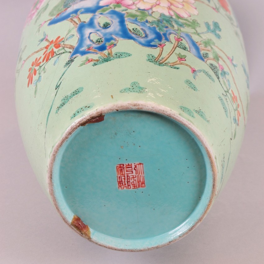 18 世纪末的乾隆时期,粉彩瓷器工艺达到鼎盛,松石地轧道粉彩作为其中的精细品类,以松石绿釉为地、轧出细密花纹再绘粉彩纹饰为特色,彰显了宫廷制瓷的奢华风格。花卉纹作为传统装饰题材,寓意生机盎然,此瓶的工艺与纹饰,反映了当时制瓷业对繁复精美风格的追求,为研究清代粉彩瓷器的巅峰技艺提供了实物依据。