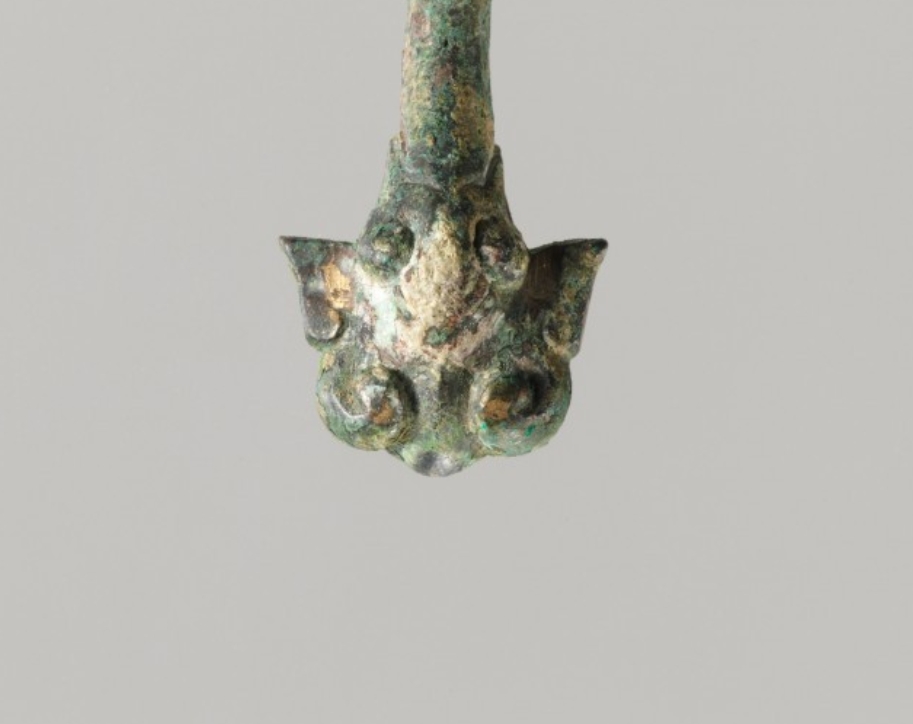 此带钩以青铜为材质,长 4.4 厘米,宽 2.2 厘米。器型小巧玲珑,整体造型规整,线条利落,虽未详述纹饰,但青铜质地坚硬,表面经岁月沉淀形成古朴包浆,兼具束腰系带的实用功能,又以青铜的原始质感展现出东周时期器物的简约风格,体现了当时青铜工艺在小型服饰配饰制作上对功能性与材质本真之美的结合,以及实用与朴素的审美取向。