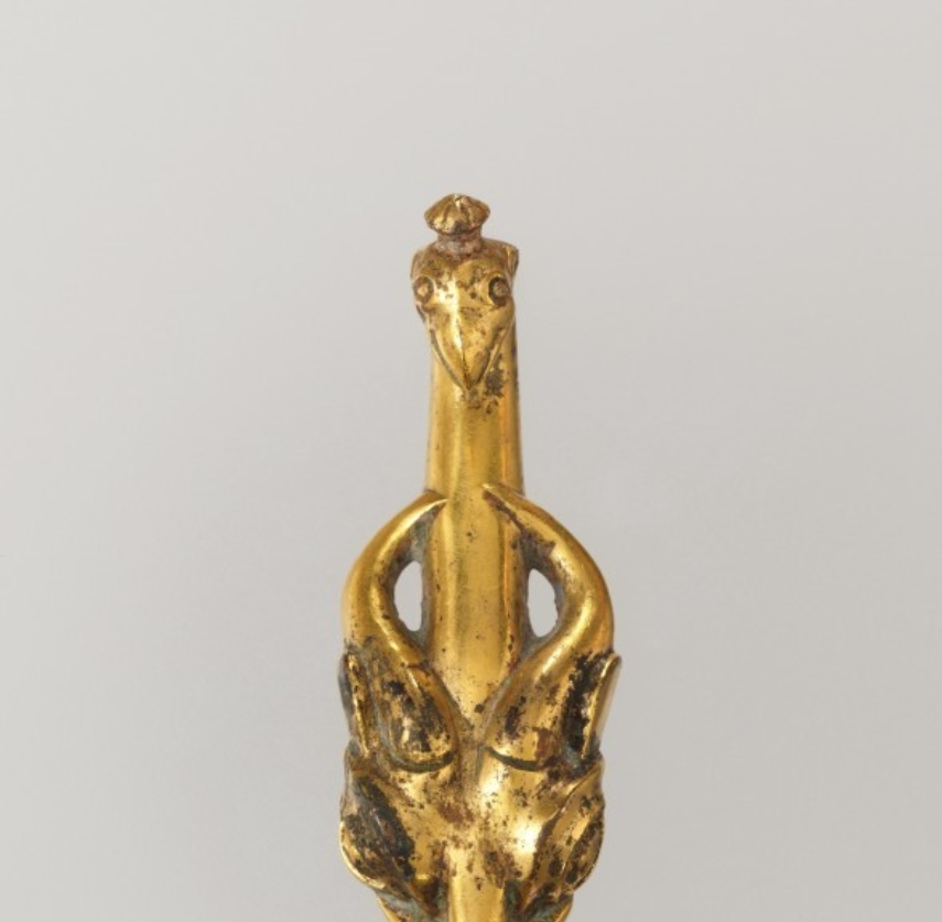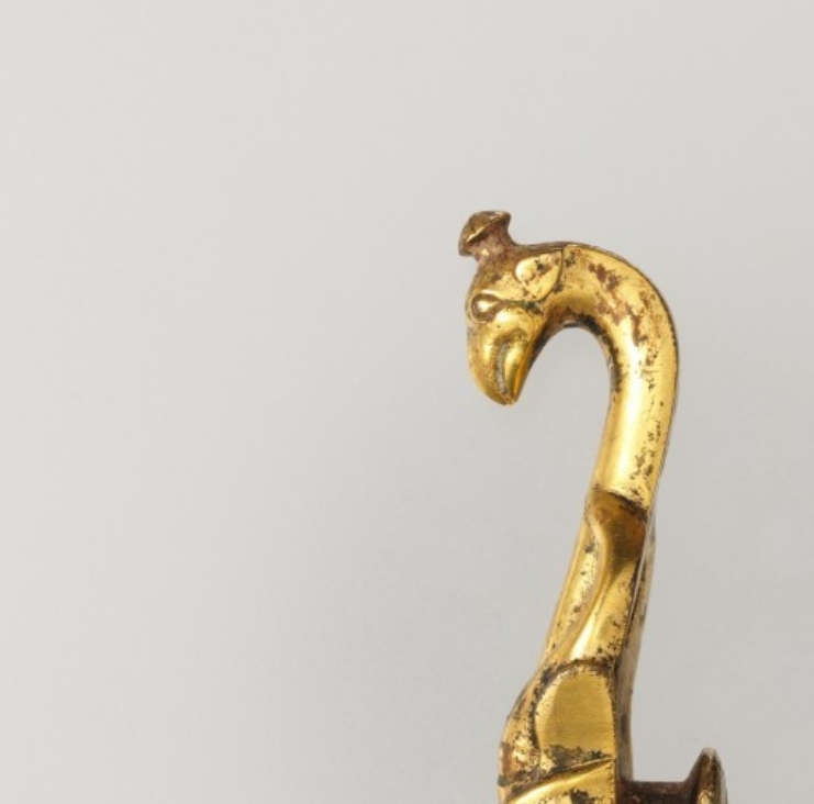 战国时期,青铜带勾作为重要的服饰配饰广泛使用,而鎏金工艺的应用则是身份地位的象征。凤鸟作为祥瑞象征,常被用于器物造型,反映了当时的审美取向与宗教信仰。此带勾的工艺与造型,为研究战国时期金属工艺的发展及服饰文化提供了实物依据。