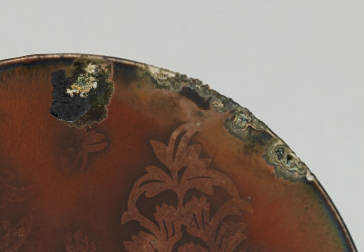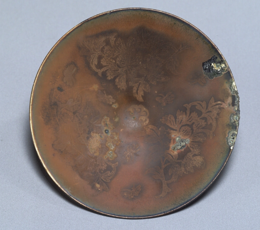 此为小型碗,几乎可以单手圈住,若仔细观察口缘的缺损部分,可知此碗釉较厚、白瓷胎极薄。如此锐利的造型正是定窑的特征,尤其是施有金彩装饰的本作品是被称为“金花定碗”的优秀之作。所谓柿釉是铁釉的一种,是指由于烧制过程中出现的化学变化,釉药表面产生柿黄色釉膜的釉。在柿釉上施以牡丹及蝴蝶形状的金彩。