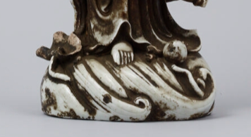 本品高41.8厘米。为立式观音造像,观音呈站立姿态,身姿挺拔,比例协调,展现出端庄肃穆的气质。头戴发髻,发髻造型规整,顶部有装饰细节,面容线条柔和,五官清晰,眉眼低垂,神态宁静慈祥,体现出观音慈悲的形象特征。身披长袍,衣纹雕刻细腻,线条流畅自然,呈现出衣物随风飘动的韵律感。长袍覆盖身体,衣褶层叠,从肩部垂落至足部,展现出丝绸般的质感,部分区域因岁月等呈现出陈旧色泽与斑驳痕迹,增添古朴韵味。观音一手自然下垂,一手动作含蓄(因角度等可能有遮挡 ),足部为跣足(赤脚 ),踏于底座之上,姿态沉稳。观音立于雕刻有海浪、山石等造型的底座,底座与观音像一体,雕刻的海浪等纹饰生动,既起到支撑作用,又营造出观音踏浪而行的意境,丰富了整体造型的艺术氛围。