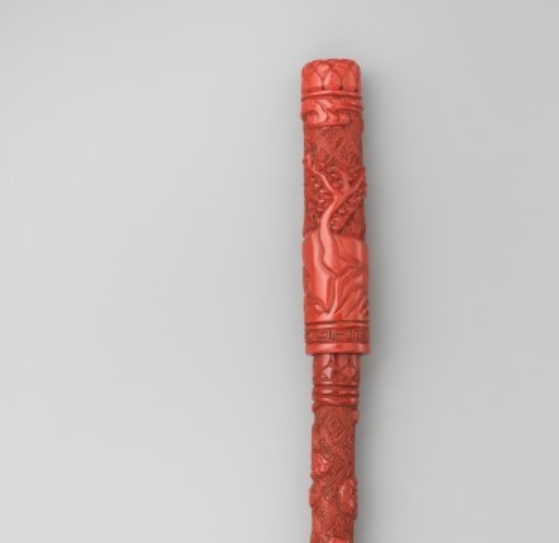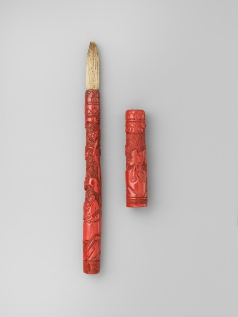 明代是剔红工艺的鼎盛时期,剔红漆器以雕刻精细、色彩明艳著称,常被用于制作文房用具等雅致器物。人物纹饰的运用赋予器物故事性与文化内涵,此毛笔的工艺与纹饰选择,反映了当时社会对剔红漆器的推崇及文房文化的繁荣,为研究明代漆器工艺与文人用具审美提供了实物依据。