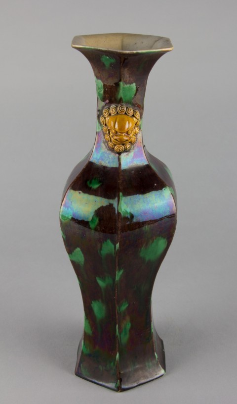 此瓶为景德镇窑产品,以彩釉素胎瓷胎为材质,高 31.8 厘米,器型呈六角形,两侧装饰狮耳。彩釉色泽丰富,狮耳造型生动,既具备陈设装饰功能,又因独特的器型设计与彩釉工艺展现出鲜明的艺术价值,体现了明代晚期景德镇窑在陶瓷造型创新与彩釉技术应用上的精湛水准。
